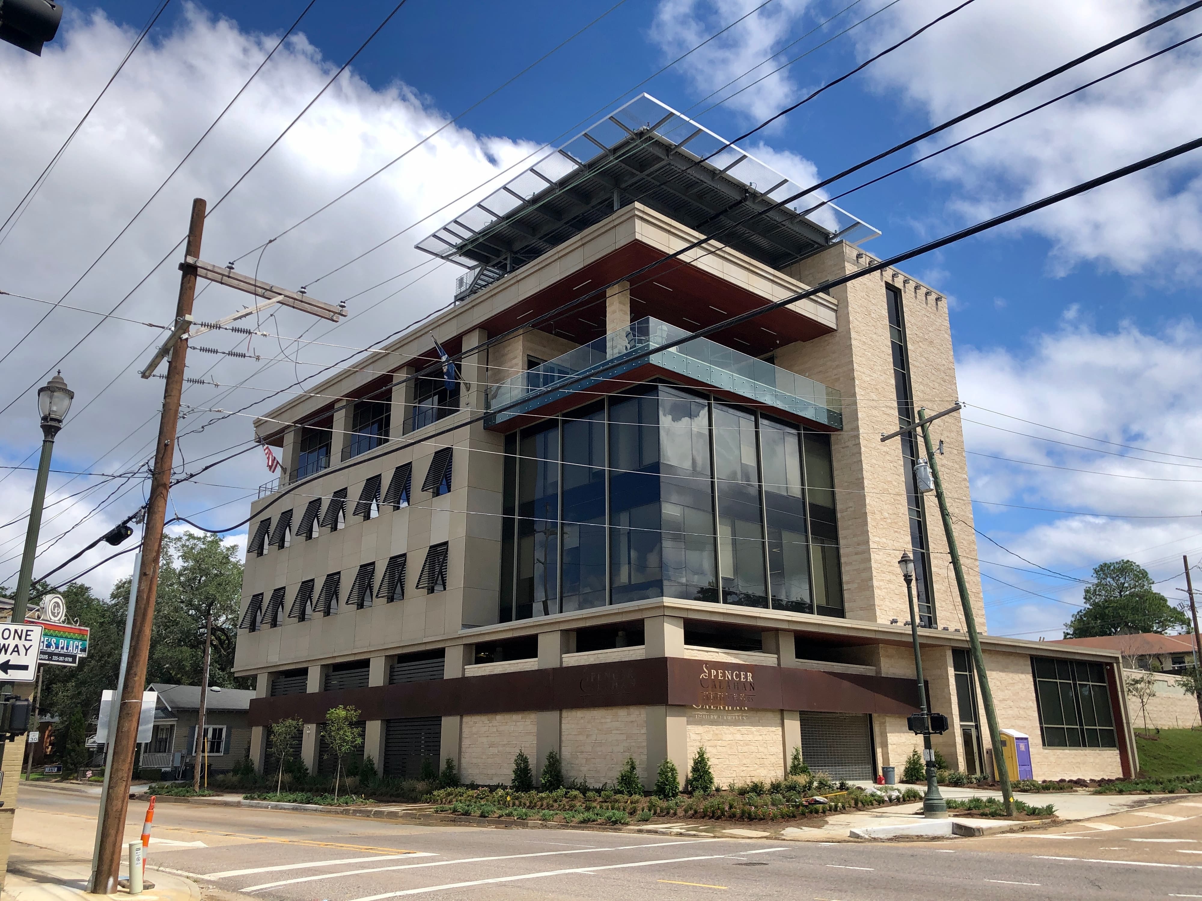 Baton Rouge attorney, Spencer Calahan and his team is finishing construction of a five-story downtown office complex. The office is located at the intersection of St. Louis Street and South Boulevard. The building features a heliport, covered terrace, two levels of parking, and three floors of office space. Construction is expected to be complete this fall. The building is prominently located downtown, along interstate 10 at the base of the Mississippi River bridge.