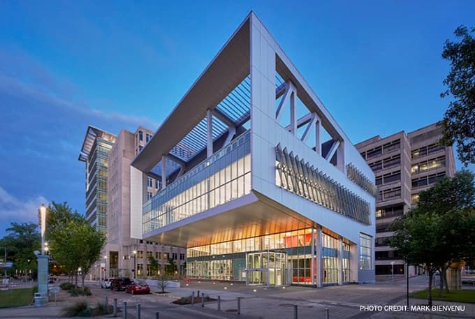 The new state-of-the-art River Center Branch Library is the center piece of North Boulevard Town Square and the Central Green - a place where our city's civic and cultural attractions come together. The 50,000 square-foot building offers many dynamic rooms of innovation and experimentation, while the 4th floor meeting rooms allow many types of dialogue and community discussion that further enhance our community. The building also features a roof top terrace and green screen with views of the surrounding community, as well as a large media screen facing Galvez Plaza. Photo credit: Mark Bienvenu