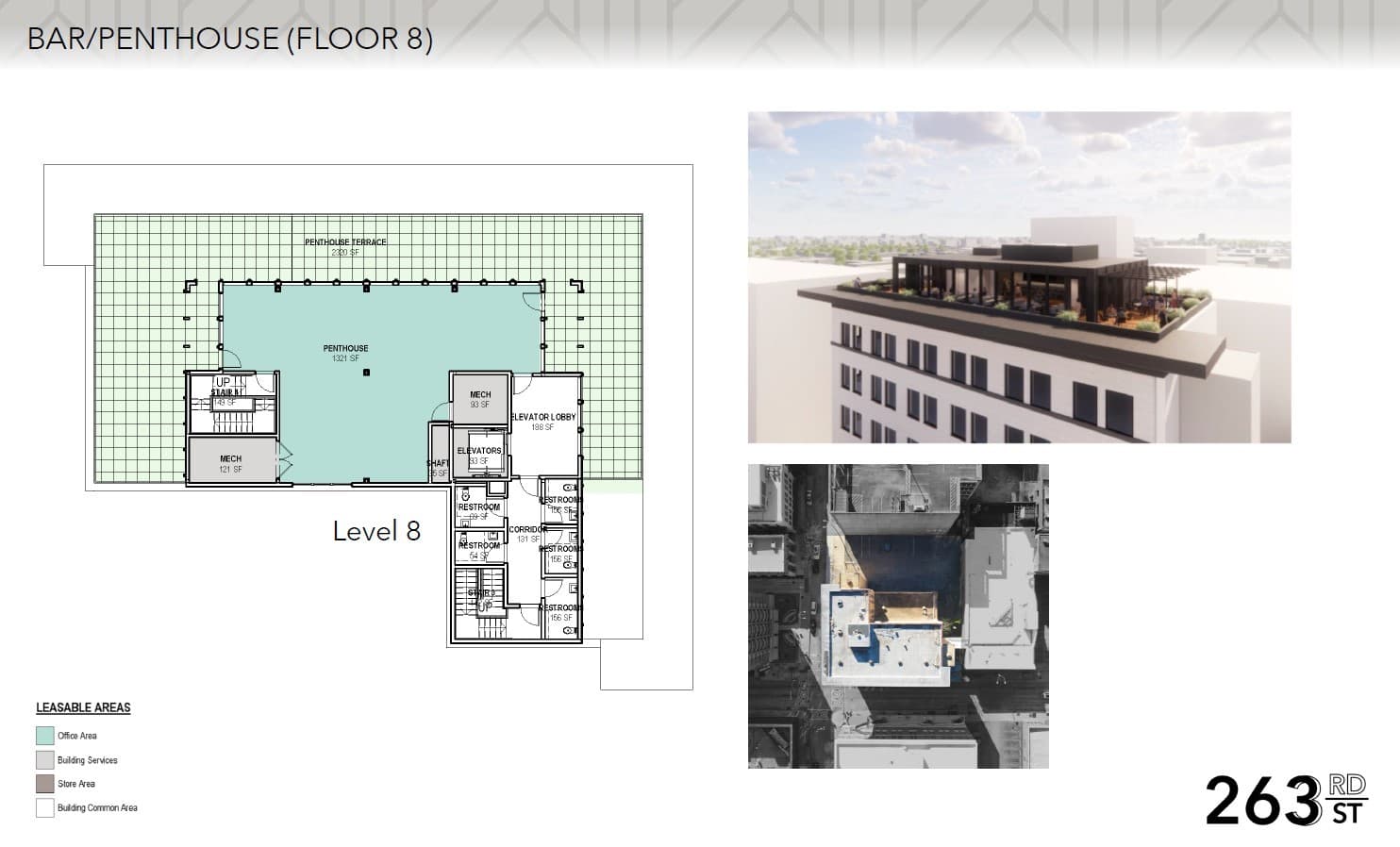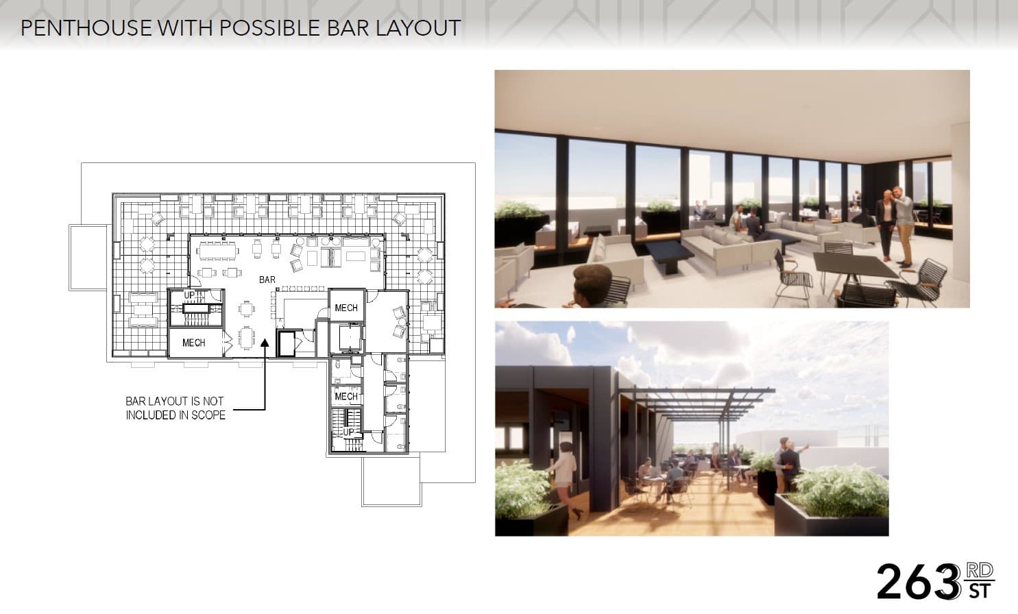 The 8th floor at the 263 Third Street promises to be one of the most unique spaces in the building for Downtown Baton Rouge. Located on Level 8, this floor features a range of leasable areas including an office area, building services, store area, and building common area. However, it's the Bar and Penthouse concept that really sets this floor apart. Renderings of the Bar and Penthouse showcase a luxurious and modern space with stunning views of the city and top-of-the-line amenities, this space is the perfect place to unwind after a long day at work or to entertain clients and guests. Whether looking for a place to relax or a space to impress, the Bar and Penthouse floor at the new development is sure to exceed expectations. Below is a more detailed rendering of the Penthouse with possible Bar layout.