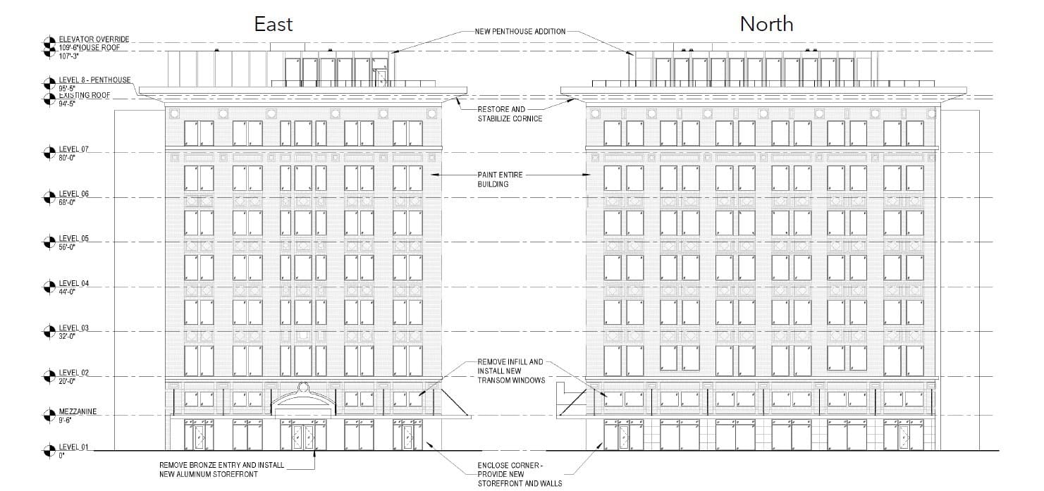 Above are the Elevations of the potential development at 263 Third Street, showcasing the East and North sides of the building and its 8 Levels. The blueprint above offers a detailed look at the exterior of the building, including its unique design elements and architectural features. With its modern and sleek aesthetic, the development is sure to become a standout feature of the downtown Baton Rouge skyline. The blueprint also provides valuable information for potential tenants, giving them a clear idea of the layout and available space within the building.