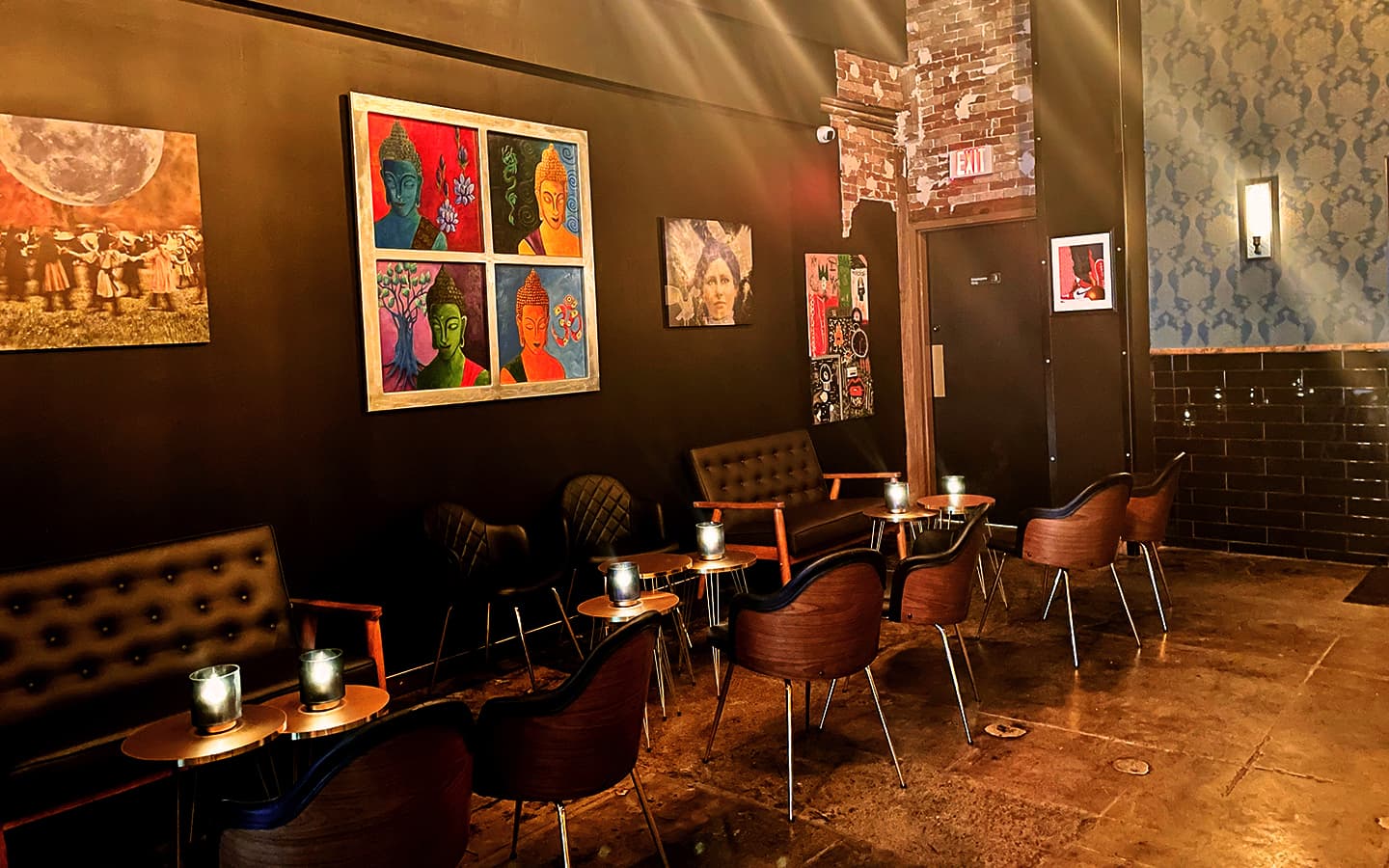 The founders of Dark 30, Kara Robinett and Aaron Franklin, have dedicated significant time and effort to create an upscale environment that exudes sophistication and relaxation. The bar's impressive 16-foot high ceiling, complemented by a stunning 15-light chandelier and royal blue and gold wallpaper, sets the stage for a memorable experience. Attention to detail is evident throughout, including the incorporation of aromatherapy to enhance relaxation. Dark 30 also proudly showcases the work of local artists such as Bryson Boutte, Loveday Funck, and Kareem Griffen, with QR codes provided to promote art sales and a constantly evolving art collection.