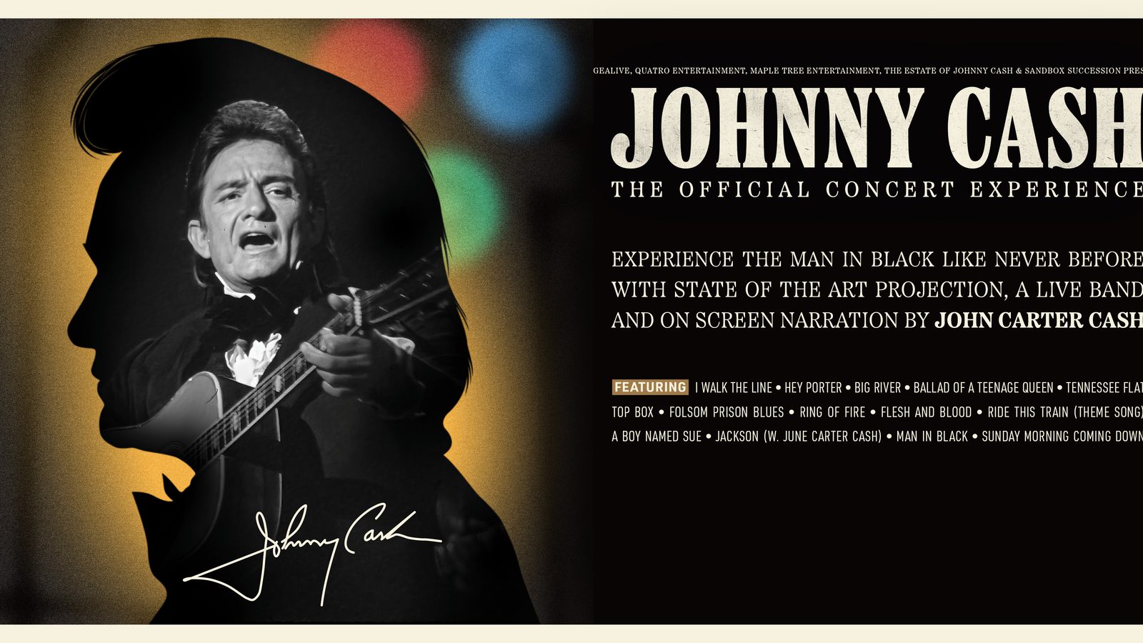 Bringing songs and stories from the “Man in Black” to the stage in a way that audiences haven’t seen or heard before. With video of Johnny from episodes of The Johnny Cash TV Show projected on a screen above the stage, a live band and singers will accompany him in perfect sync. This concert experience will showcase iconic performances from the TV show and highlight the spirit of the legend by revisiting some of his memorable words and anecdotes. Cash will perform some of his biggest hits, including “Folsom Prison Blues,” “Ring of Fire, “And “I Walk the Line,” and share stories of people he met along the way whose causes he championed–the working man from all walks of life. Plus, onstage male and female singers will split vocal duties performing their own takes on Cash hits. The music never stops in this concert event!