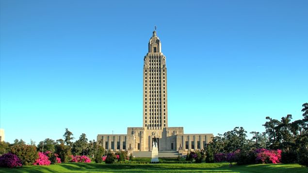 The tallest capitol in the U.S., the building is 450 feet high with 34 floors. The Observation Deck on the 27th floor overlooks the city of Baton Rouge at a height of 350 feet. Gift shop and food service available.